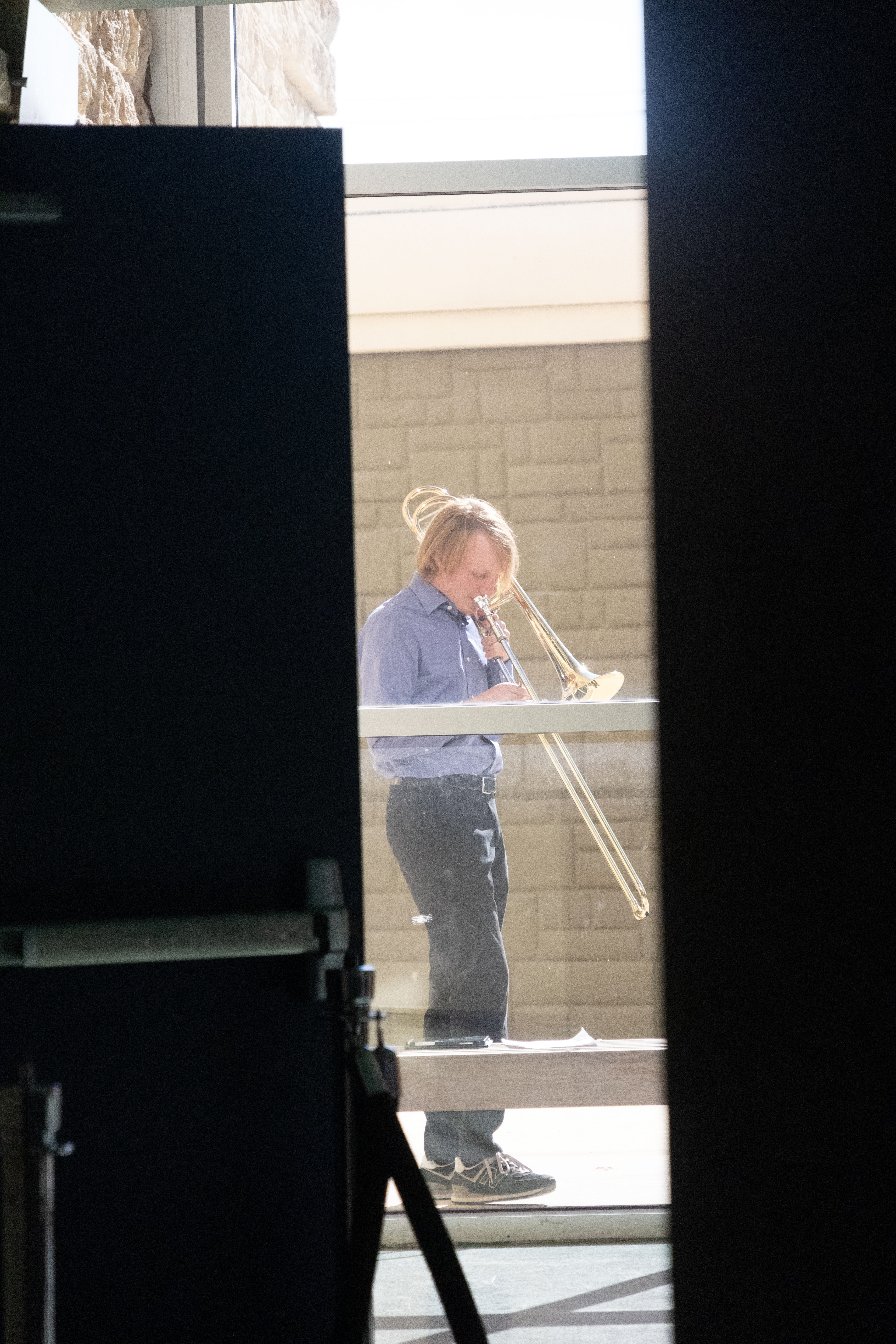 A UNT music trombone player practices outside of the Murchison Performing Arts Center. Ashley Gomez