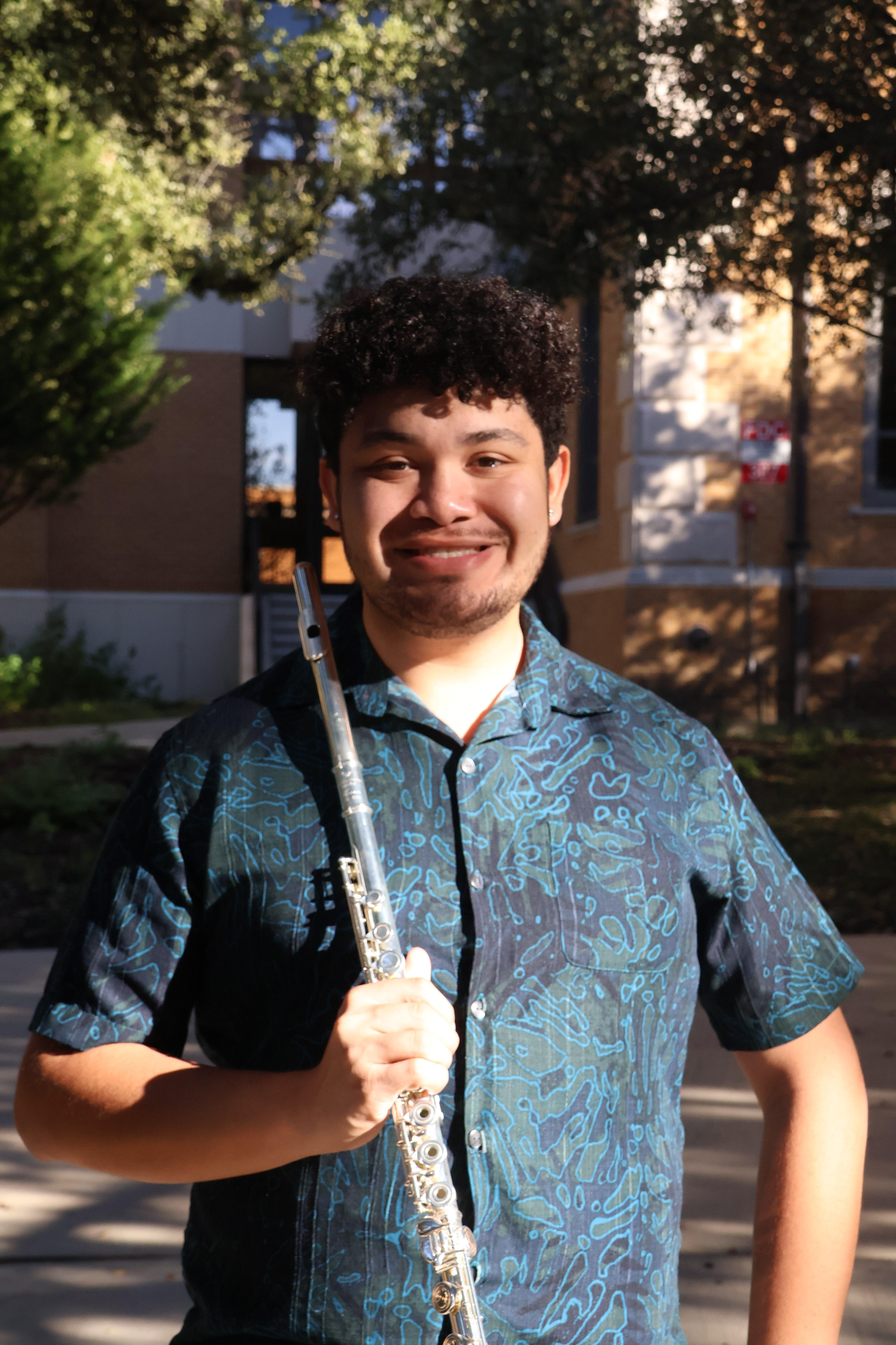 Senior Tony Acevedo poses in front of Sycamore Library. Though no longer apart from the Mean Green Brigade, his love for the flute is strong, and he continues to practice frequently. Ashley Gomez