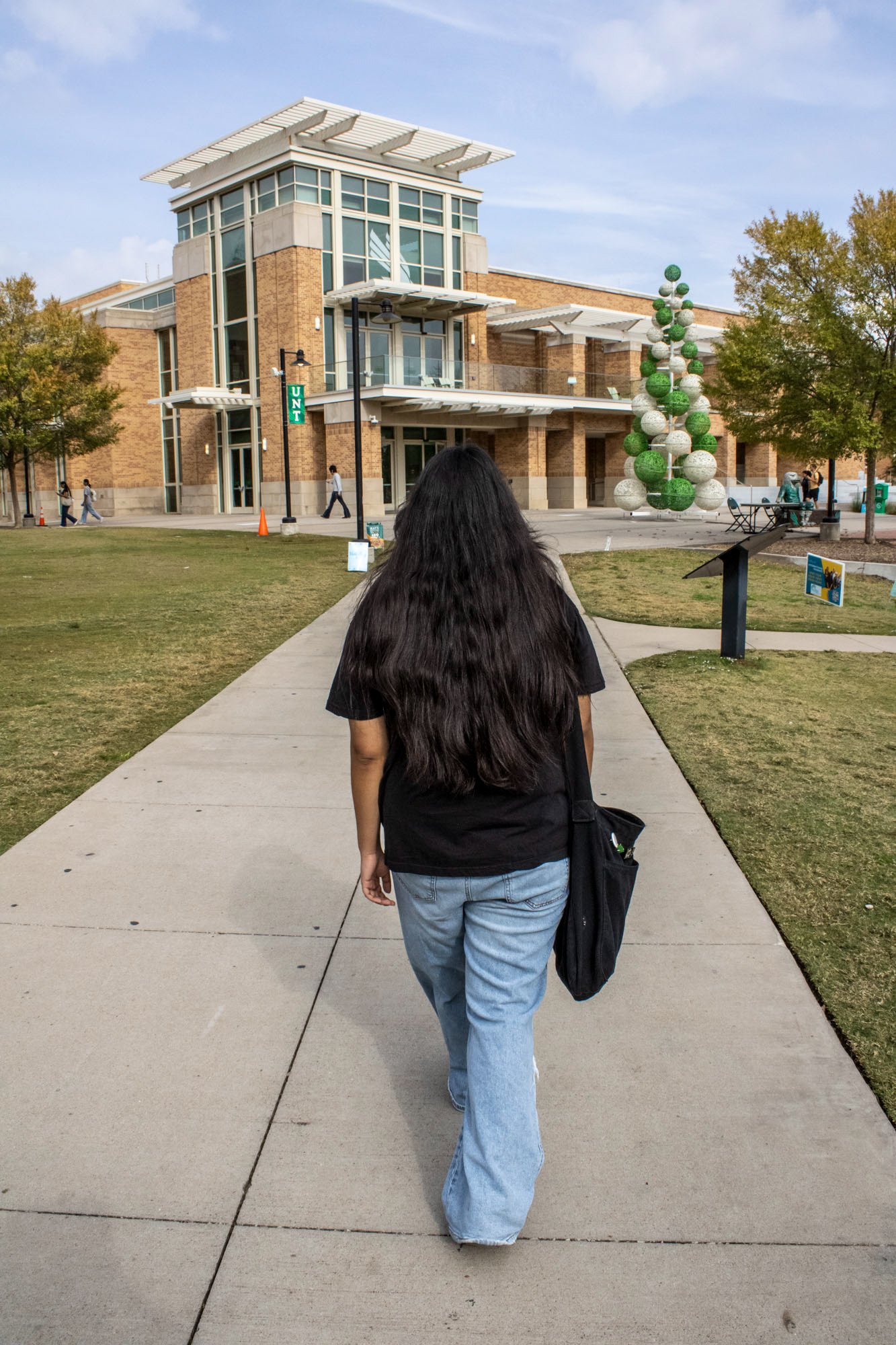 Student, Jazzlyn Hernandez, 18, walks to class at the University of North Texas. Alyssa Askue