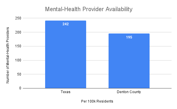 Mental-health provider availability in Denton County (195 providers per 100,000 residents) falls below the Texas statewide average (242 per 100,000), according to Healthy North Texas and the Texas Department of State Health Services. Tabitha Hidalgo